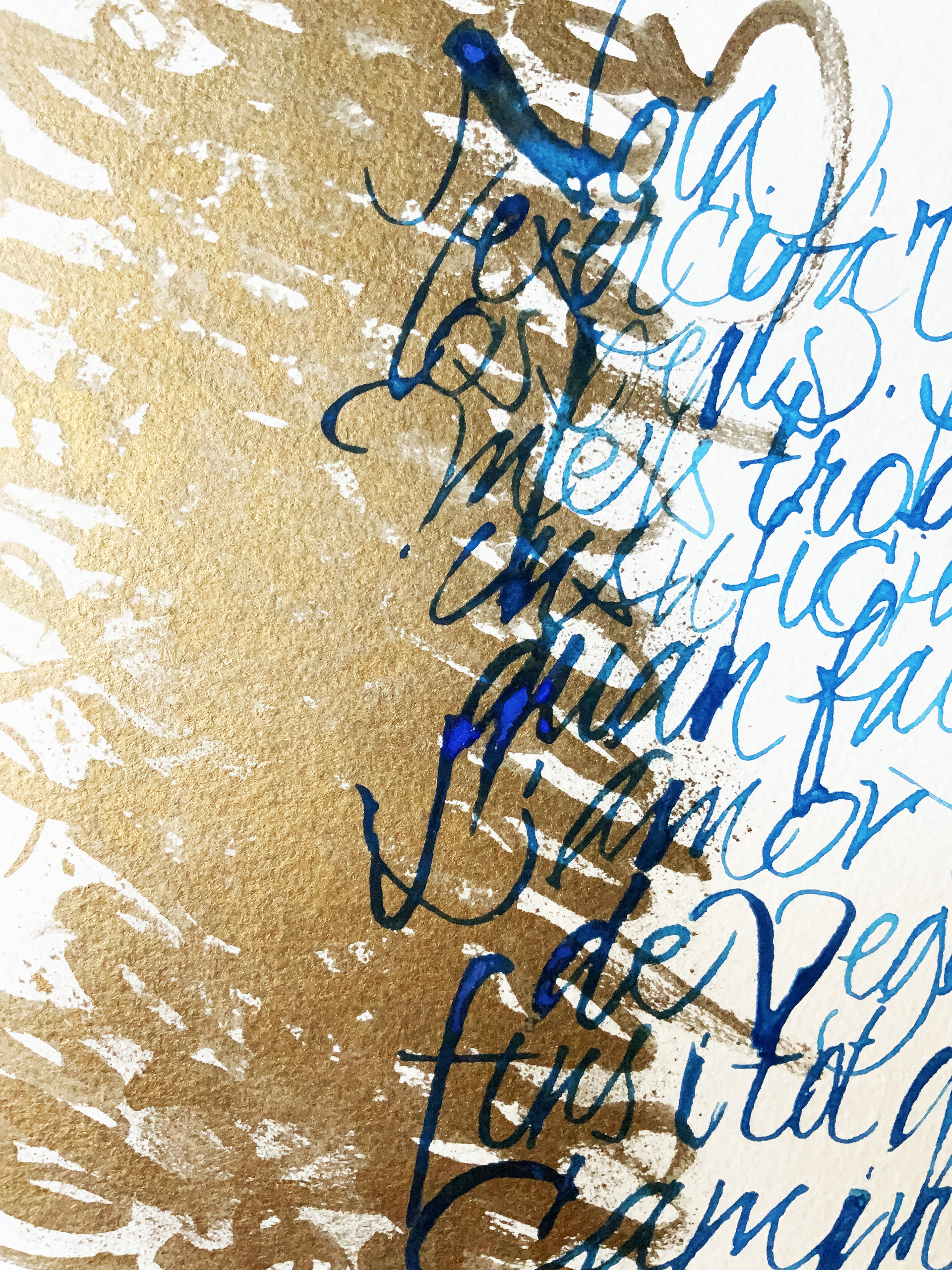 Composición expresiva con el poema de Mari Chordà del libro Umbilicals, tamaño DIN A3 realizado con pincel y tiralínias.