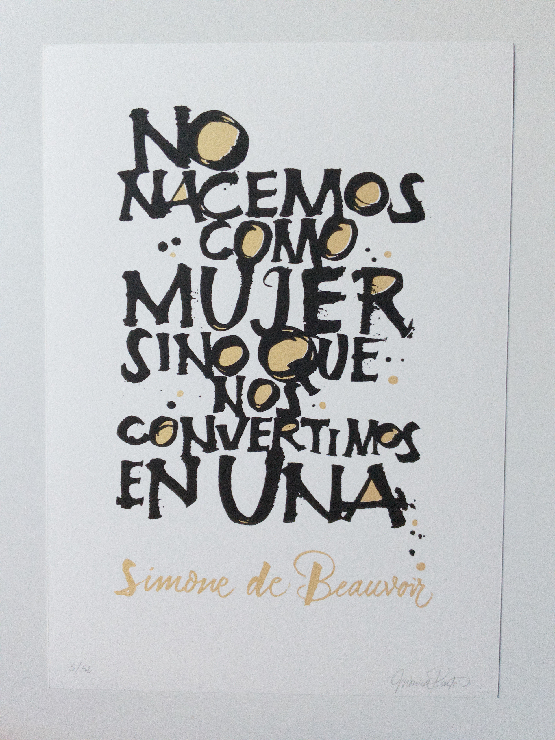Serigrafía en fondo blanco y negro con la celebre frase de Simone de Beauvoir On ne naît pas femme, on le devient, traducida al castellano. 25 copias de cada color en un tamaño DinA3 y a dos tintas.