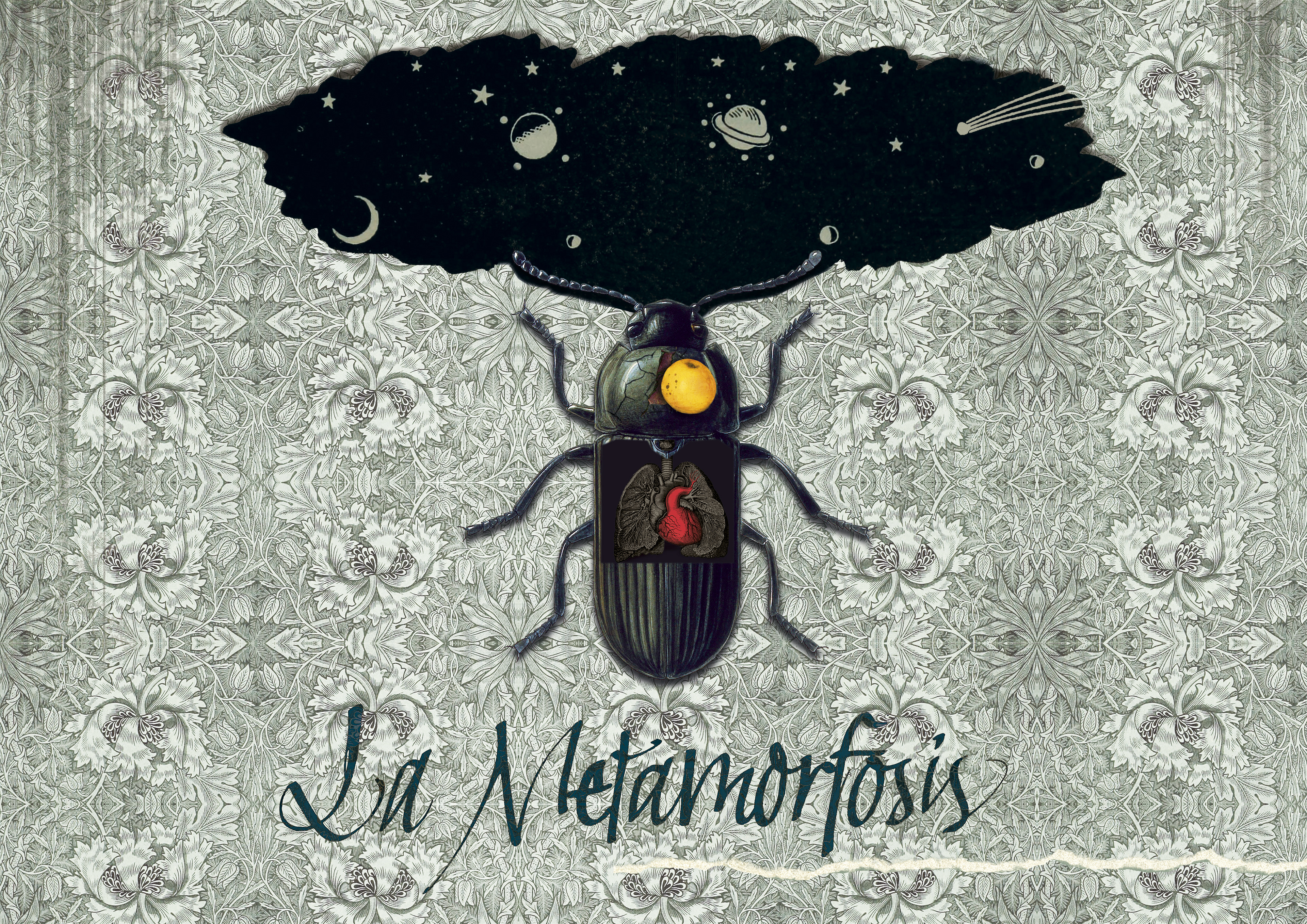 Diseño de una serie de postales con temática literaria. Proyecto creado con la técnica del collage digital además de caligrafía. Esta es mi personal visión de "La Metamorfosis" de Franz Kafka, un insecto que había sido humano, con una leve señal del rechazo familiar-social (una manzana incrustada en su caparazón) encerrado en su habitación. Quiero imaginarlo soñando con escapar a un mundo mejor.